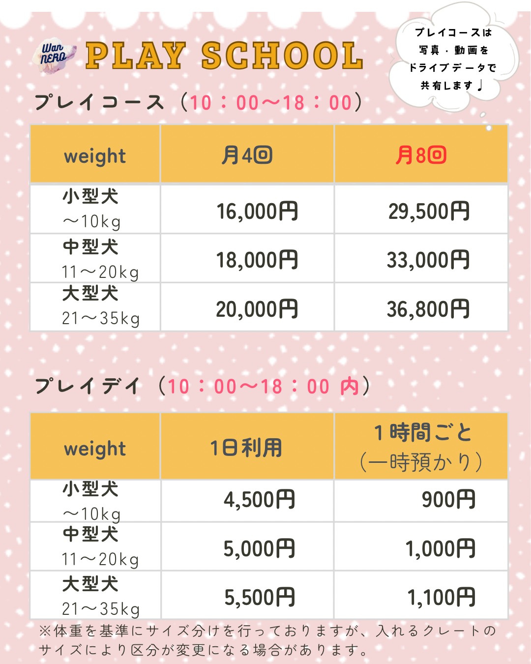 ※凶暴性の高い子や、他のわんちゃんに危害を加える恐れがある子は、事前にカウンセリングを受けていただき、その後体験入園前に個別トレーニングが必要となる場合がございます。